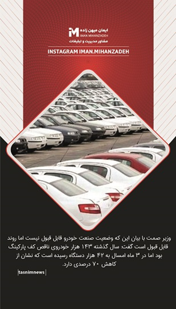 وزیر صمت با بیان اینکه وضعیت صنعت خودرو قابل قبول نیست اما روند قابل قبول است گفت : سال گذشته 143 هزار خودروی ناقص کف پارکینگ بود اما در 3 ماه امسال به 42 هزار دستگاه رسیده است که نشان از کاهش 70 درصدی دارد.